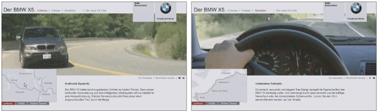 Für den X5 bietet BMW dem User eine Premiumseite auf welcher über die volle Breite des Ausgabefensters Videosequenzen angezeigt werden. Die Navigation am unteren linken Bildschirmrand